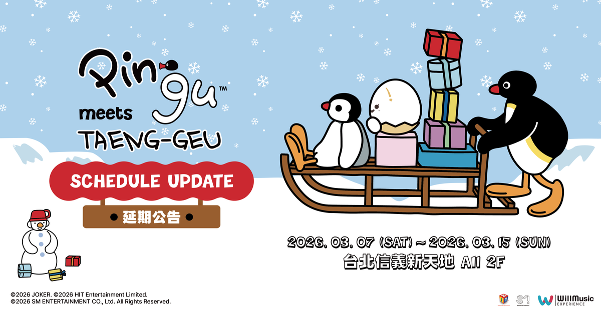 原訂【PINGU X TAENG-GEUPOP-UP STORE IN TAIWAN 快閃店活動,因受物流通關及相關審查流程之不可抗力因素影響,本次快閃店將延期舉行。對於本次延期所造成之不便,感謝您的理解與支持。
